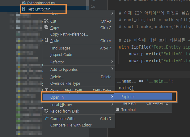 파일(Test_Entity01.zip) 을 마우스 오른쪽 버튼으로 클릭하고 -> Explorer(Windows 탐색기) 를 선택하면 아래와 같이 폴더에 아카이브 파일이 표시됩니다.