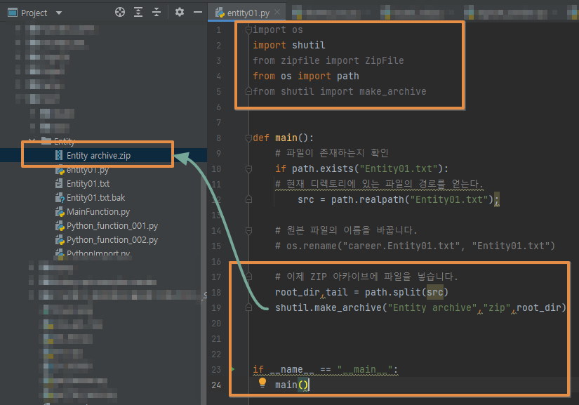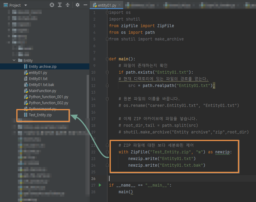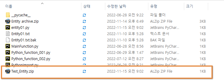 - 이름( "Test_Entity01.zip, "w")으로 새 Zip 파일을 만듭니다.